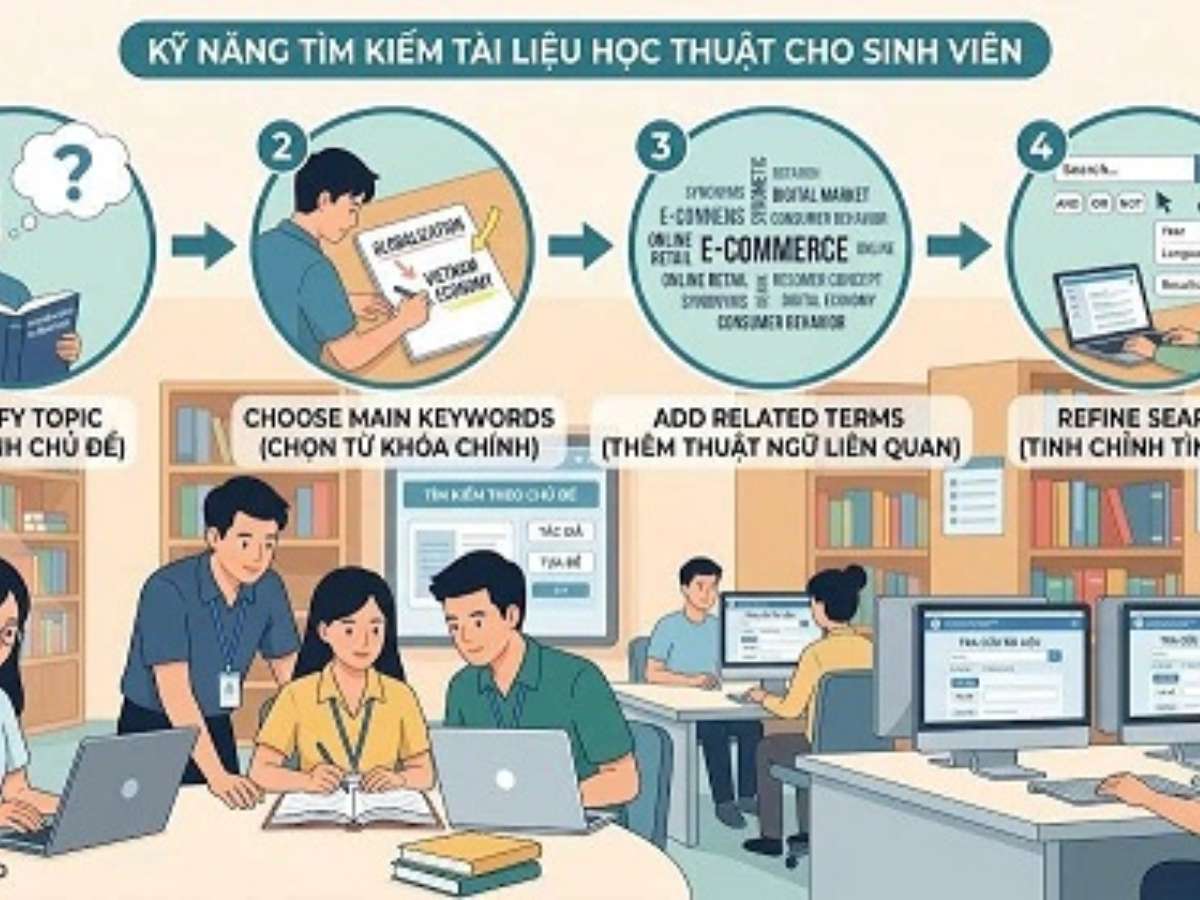Để việc tìm kiếm tài liệu học thuật trở nên hiệu quả hơn, sinh viên và giảng viên nên chuẩn bị danh sách từ khóa trước khi bắt đầu tra cứu và kết hợp linh hoạt các biến thể từ khóa trong quá trình tìm kiếm.