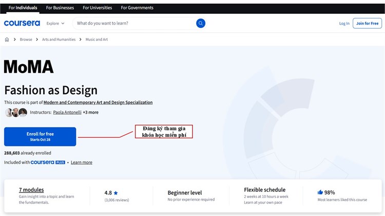 Khóa học “Fashion as Design” được cung cấp bởi The Museum of Modern Art – MoMA, một trong những trung tâm nghệ thuật hàng đầu thế giới, nơi khơi nguồn sáng tạo, truyền cảm hứng và nuôi dưỡng tư duy nghệ thuật đương đại, nơi có nhiều chương trình học trực tuyến hấp dẫn cũng như cung cấp các khóa học dành cho giáo viên K-12, giúp người học khám phá và giảng dạy nghệ thuật một cách sáng tạo và hiệu quả.